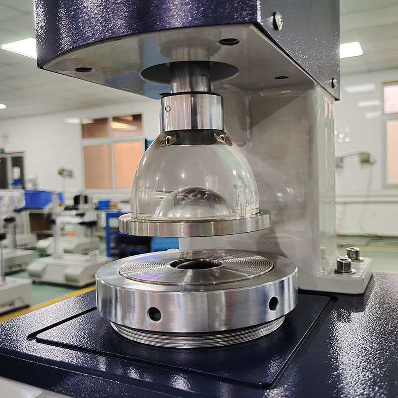 在儀器密封的油缸和壓紙座的容腔內(nèi),裝滿甲基硅油作為壓力傳遞的介質(zhì),當(dāng)電機(jī)帶動(dòng)活塞勻速前進(jìn)時(shí),橡皮膜受到硅油的加壓而突起,此時(shí)夾持在膠膜上方,被上下夾盤固定住的試樣,均勻受力,直到試樣破裂,處理芯片鎖住最大壓力值,通過液晶屏顯示該壓力值,此壓力值即為本次試樣的耐破度。